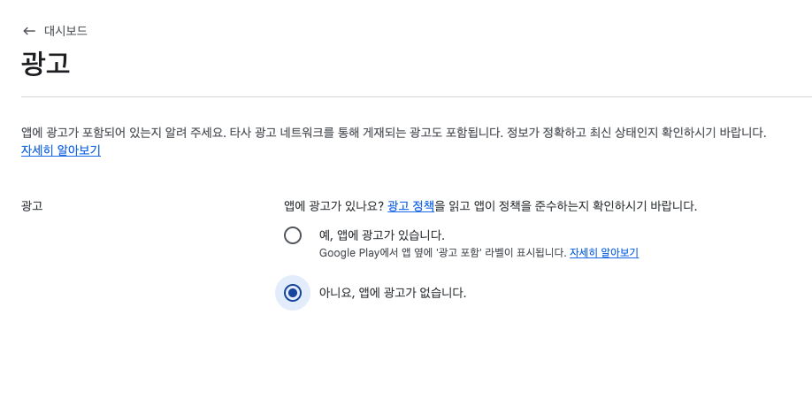 앱 출시 후에도 대시보드(정책/콘텐츠) 설정은 변경 가능해서 추후 광고 추가할 거면 나중에 변경하면 된다!